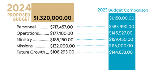 Our 2023 budget prioritized expanded staff as a result of the growth we experienced after the covid season. We now have a total of 13 people on staff at Sojourn! The 2024 budget, continues to prioritize key changes to our staff team as we work to structure to better care for and equip our growing congregation.